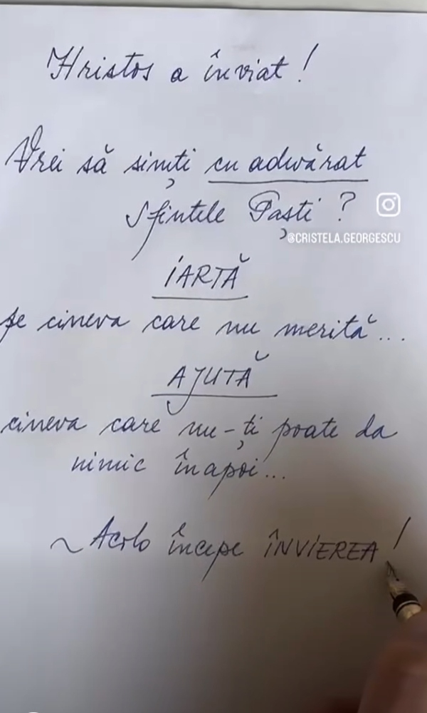 Sursa: Cristela Georgescu, mesaj profund despre esența Sărbătorilor Pascale: ”Acolo începe ÎNVIEREA!”-FOTO