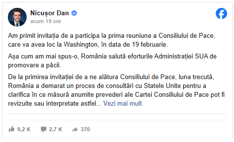 Nicușor Dan a anunțat că a primit invitația de a participa la prima reuniune a Consiliului de Pace, eveniment care va avea loc la Washington, în data de 19 februarie. Șeful statului a precizat însă că prezența României la această reuniune nu este automată și va depinde de rezultatul unor consultări în curs cu Administrația Statelor Unite.