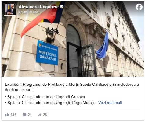 Ministrul Sănătății, Alexandru Rogobete, a anunțat că va finanța includerea a două noi spitale în Programul de Profilaxie a Morții Subite Cardiace.