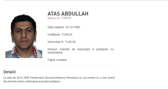 Încarcerat în Penitenciarul Rahova pentru 22 de ani și 10 luni, după ce Curtea de Apel București l-a condamnat definitiv, în 2017, Abdullah Atas,un cetățean de naționalitate turcă, încarcerat pentru săvârșirea infracțiunii de omor, nu a mai revenit în penitenciar, după ce a beneficiat de permisie în perioada 23-26.01.2026.