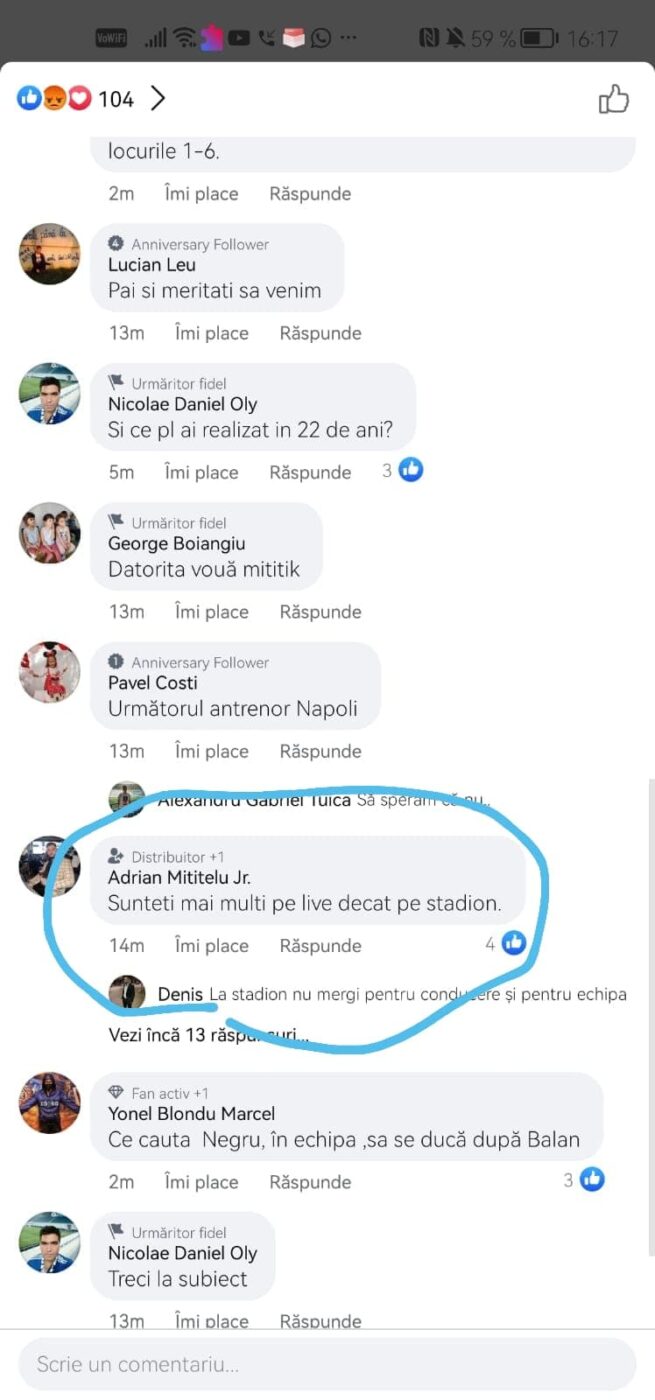 Într-un acces de furie, persoanele care se ocupă de imaginea clubului oltean în mediul online nu au mai ținut cont de nimic și au coborât la ultimul nivel, înjurându-l pe unul dintre suporterii care comenta în timpul transmisiei live a discursului maraton susținut de Adrian Mititelu.