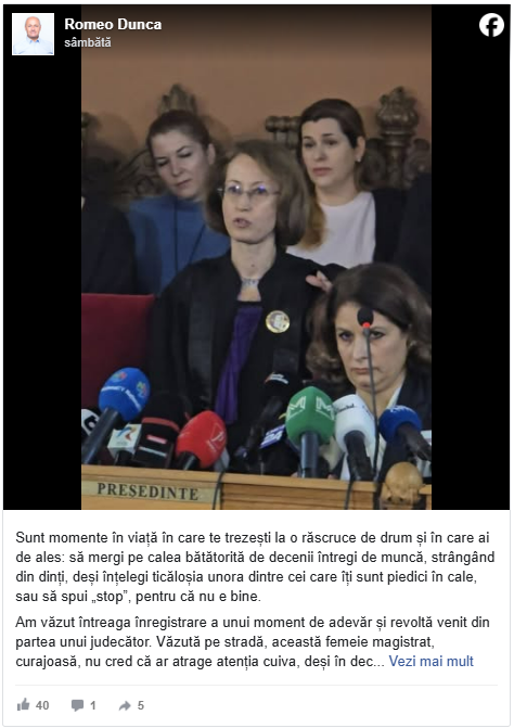 Am văzut întreaga înregistrare a unui moment de adevăr și revoltă venit din partea unui judecător. Văzută pe stradă, această femeie magistrat, curajoasă, nu cred că ar atrage atenția cuiva, deși în deciziile ei au stat poate destinele multor oameni. Cum i-a judecat și ce se va întâmpla cu ei nu știu, dar dacă, la o adică, va fi să risc a-mi pierde libertatea, pe mâna unui astfel de judecător aș vrea să ajung. E ultima dorință pe care un om normal, și care se crede cinstit, o poate avea, în speranța că adevărul va triumfa. De asta avem nevoie, și asta, azi, se pare că e pierdută. Speranța că cei care te judecă sunt oameni ca și noi, dar mult mai corecți, chiar până la exagerare, cu frică de Dumnezeu, și în sufletul cărora, de fiecare dată când trimit la închisoare un infractor, există ore întregi de îndoială și nesomn până la coșmar, întrebându-se dacă nu cumva au greșit. Iar atunci când sunt siguri și probele sunt indubitabile, să nu ezite să facă dreptate, nici dacă e vorba să-l trimită la închisoare pentru răul făcut lui David, pe cel mai puternic Goliat.