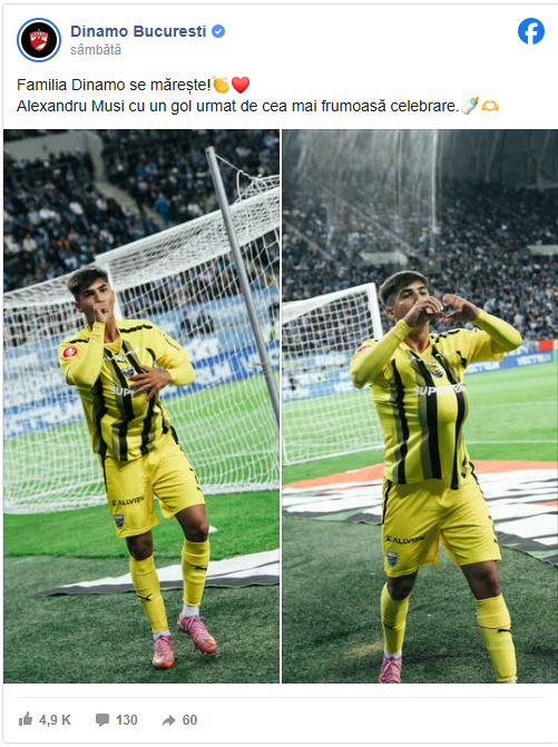 Reușita lui Musi din viața personală a fost sărbătorită și de clubul din „Ștefan cel Mare”. Pe Facebook, Dinamo a postat un mesaj pentru Alex și Antonia și două fotografii cu „șeptarul” din meciul din Bănie. „Familia Dinamo se mărește! Alexandru Musi cu un gol urmat de cea mai frumoasă celebrare”, au scris „câinii roșii”.