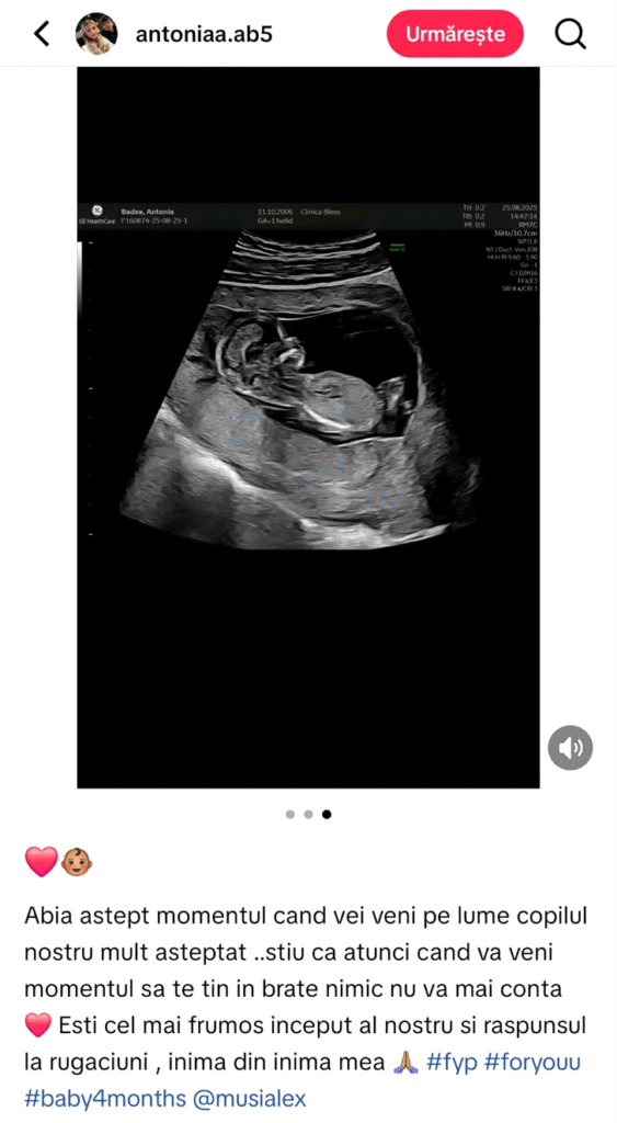 La aceasta, iubita lui Alex Musi a adăugat o fotografie cu extrema stângă de la Dinamo, dar și o ecografie care să ateste faptul că urmează să aducă pe lume un copil.