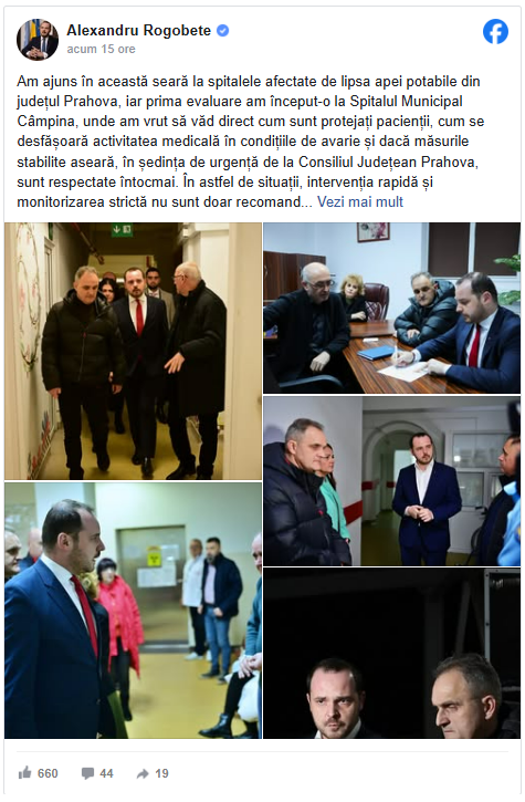 „Am ajuns în această seară la spitalele afectate de lipsa apei potabile din județul Prahova, iar prima evaluare am început-o la Spitalul Municipal Câmpina, unde am vrut să văd direct cum sunt protejați pacienții, cum se desfășoară activitatea medicală în condițiile de avarie și dacă măsurile stabilite aseară, în ședința de urgență de la Consiliul Județean Prahova, sunt respectate întocmai. În astfel de situații, intervenția rapidă și monitorizarea strictă nu sunt doar recomandate, ci obligatorii.