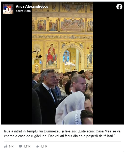 „Isus a intrat în Templul lui Dumnezeu şi le-a zis: „Este scris: Casa Mea se va chema o casă de rugăciune. Dar voi aţi făcut din ea o peşteră de tâlhari”, a scris Anca Alexandrescu.