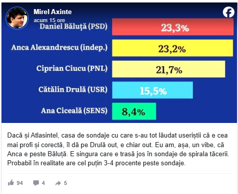 „Dacă și Atlasintel, casa de sondaje cu care s-au tot lăudat useriștii că e cea mai profi și corectă, îl dă pe Drulă out, e chiar out. Eu am, așa, un vibe, că Anca e peste Băluță. E singura care e trasă jos în sondaje de spirala tăcerii. Probabil în realitate are cel puțin 3-4 procente peste sondaje.” a scris Axinte, un comentatror mai degrabă apropiat taberei reziștilor.