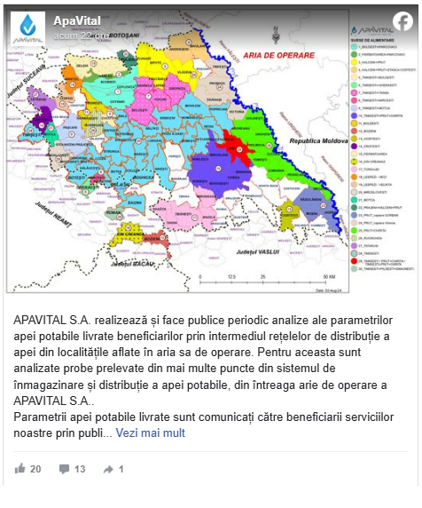 ”Staţia de tratare de la Chiriţa are 0,5 mg clor la litru, iar staţia Şorogari înregistrează 0,3 mg/l. Toate probele sunt conforme, nu există probleme. Apa este verificată din punct de vedere al calităţii înainte de a fi livrată populaţiei, printr-un sistem de control pe trei trepte. Verificările vizează atât procesul propriu-zis, cât şi etapele de înmagazinare şi tratare a apei. Controalele sunt realizate la fiecare două ore pentru întreaga cantitate de apă potabilă care pleacă din staţiile de tratare, iar o dată pe lună probele sunt verificate şi transmise pentru control de audit către Direcţia de Sănătate Publică”, a afirmat Răzvan Manolache, purtătorul de cuvânt al ApaVital Iaşi.