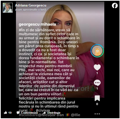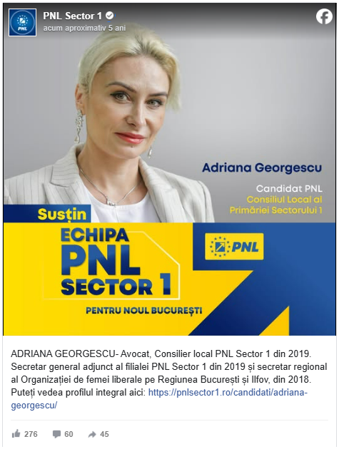 Avocata Adriana Georgescu era, potrivit surselor, dar și numeroaselor dovezi existente pe rețelele de socializare, un reprezentant de seamă al PNL Sector 1 și apropiată a tuturor liderilor PNL, de la Ludovic Orban și Nicolae Ciucă până la Ilie Bolojan și Ciprian Ciucu. De asemenea, era o susținătoare asumată a președintelui Nicușor Dan.
