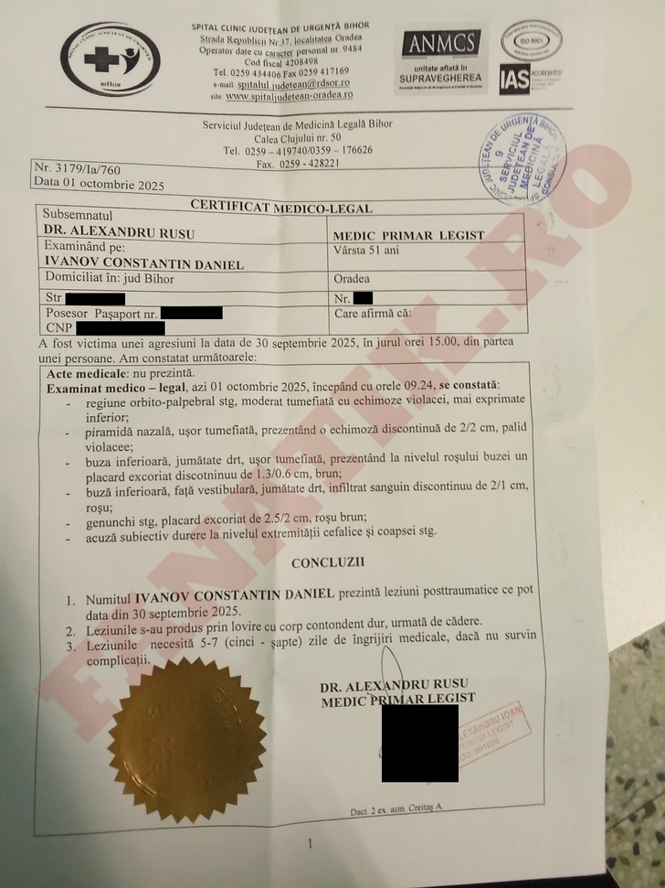 Constantin Ivanov a transmis pe adresa redacției două fotografii, una cu figura tumefiată iar cealaltă cu documentul pe care l-a primit de la IML. Acesta indică faptul că bărbatul a fost victima unei agresiuni la data de 30 septembrie 2025, în jurul orei 15:00.