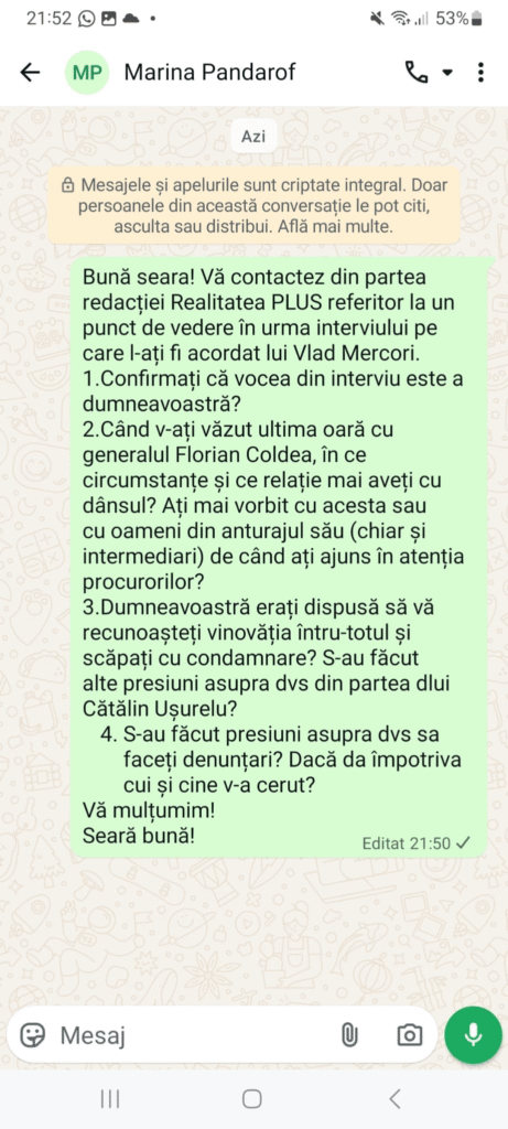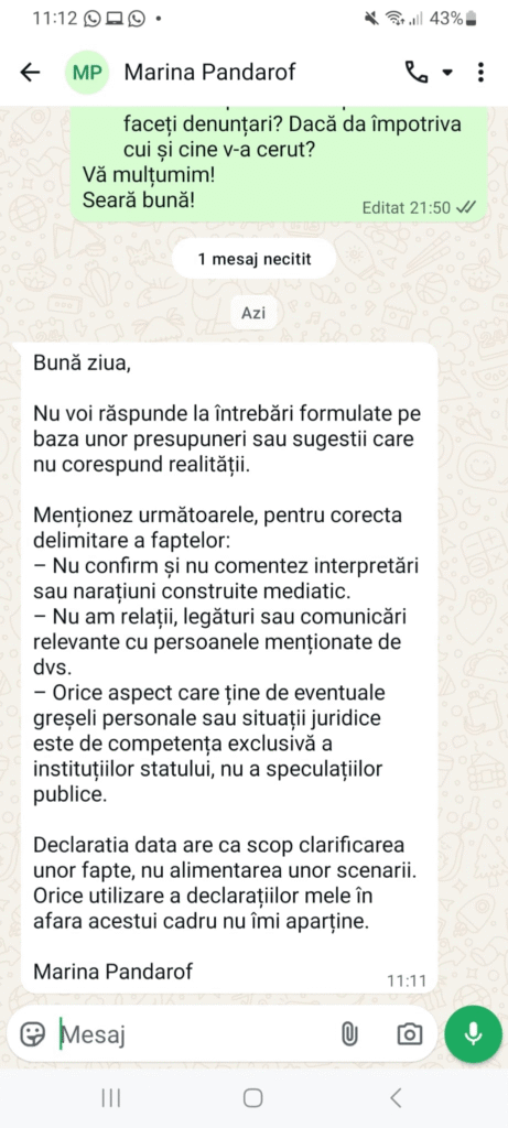 Fără nicio reținere, Marina Pandarof recunoaște practic că dosarul său fusese uitat într-un sertar până când dezvăluirile de la Realitatea PLUS l-au readus în atenție. „Până în iunie 2024, când, la presiunile Ancăi Alexandrescu, au scos dosarul.”