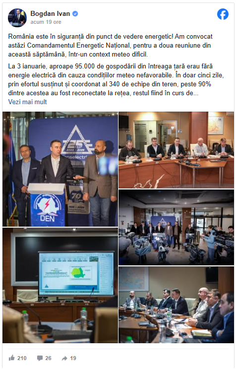 „La 3 ianuarie, aproape 95.000 de gospodării din întreaga țară erau fără energie electrică din cauza condițiilor meteo nefavorabile. În doar cinci zile, prin efortul susținut și coordonat al 340 de echipe din teren, peste 90% dintre acestea au fost reconectate la rețea, restul fiind în curs de soluționare.