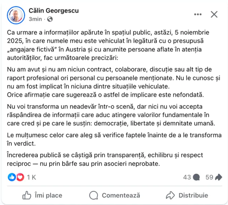 „Ca urmare a informațiilor apărute în spațiul public, astăzi, 5 noiembrie 2025, în care numele meu este vehiculat în legătură cu o presupusă „angajare fictivă” în Austria și cu anumite persoane aflate în atenția autorităților, fac următoarele precizări: