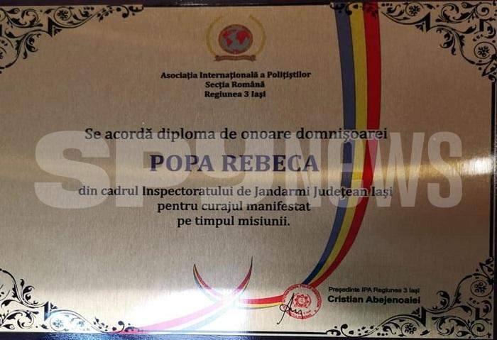Având în vedere faptul că viața echipajului era pusă în pericol, dar și a participanților la trafic, colega noastră a executat foc cu armamentul din dotare pentru imobilizarea autovehiculului, după ce în prealabil conducătorul a fost somat și avertizat. După o lungă urmarire, conducatorul auto a fost prins ca urmare a rănii provocate de glonț în zona umărului. Pentru aceste fapte, dar și pentru dăruirea cu care se implică în executarea misiunilor, suntem mandri că plt. Popa Rebeca face parte din asociația noastră și îi spunem azi la ceas aniversar: SĂRUT FEMEIE, MÂNA TA!”.
