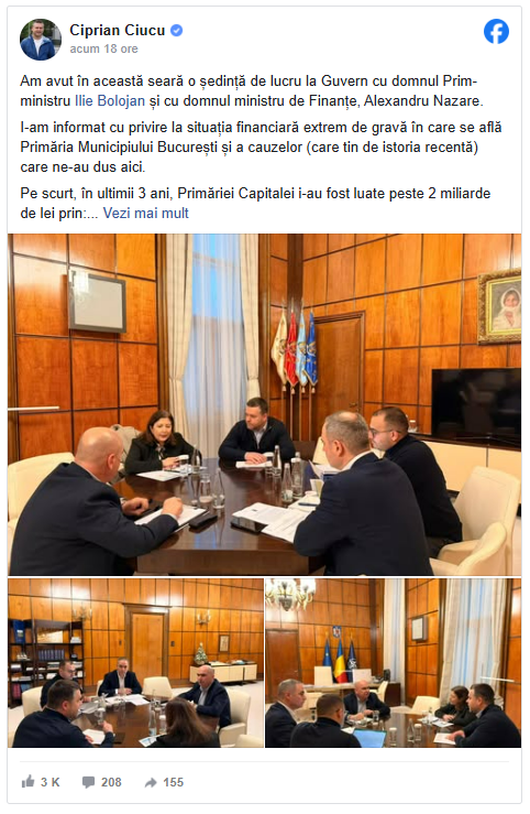 Primarul general afirmă că i-a informat pe reprezentanții Guvernului cu privire la contextul creat în ultimii ani, pe care îl descrie ca fiind rezultatul unor decizii politice recente. „I-am informat cu privire la situația financiară extrem de gravă în care se află Primăria Municipiului București și a cauzelor (care țin de istoria recentă) care ne-au dus aici”, a scris Ciprian Ciucu.