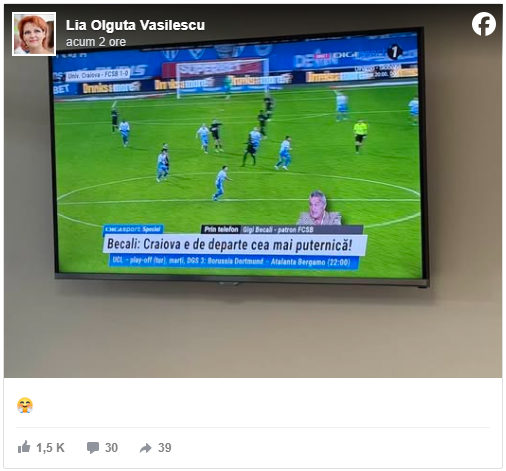 Aceasta a postat o imagine sugestivă la finalul confruntării, cu un televizor dat pe Digi Sport, acolo unde vorbea Gigi Becali. Olguța a pus un emoticon ce simbolizează satisfacția și bucuria pentru cele văzute. Patronul echipei FCSB a recunoscut că trupa condusă de Filipe Coelho a fost superioară celei bucureștene. „Craiova e de departe cea mai puternică”, stătea scris pe ecranul emisiunii pe care Olguța Vasilescu o urmărea.