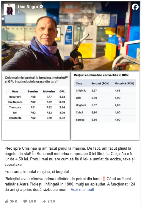 Cunoscutul om de televiziune Dan Negru a rămas șocat când a văzut cât costă litrul de motorină în Republica Moldova, comparativ cu România. „La noi nu am alimentat mașina, ci bugetul!”. Vedeta nu-și poate explica de ce motorina din România costă aproape 8 lei pe litru, în timp ce în Republica Moldova e doar 4,50 lei!