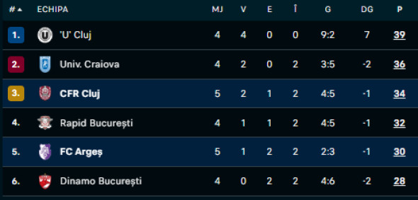Clasamentul din play-off, după FC Argeș – CFR Cluj 0-1