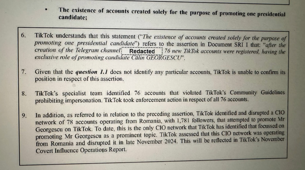 „TikTok înțelege că această afirmație (…) se referă la susținerea din paragraful 1.1 al Documentului SRI 1 conform căreia o ‘rețea de conturi asociate direct cu campania lui Călin GEORGESCU a constat inițial în 25.000 de conturi pe platforma TikTok’.”