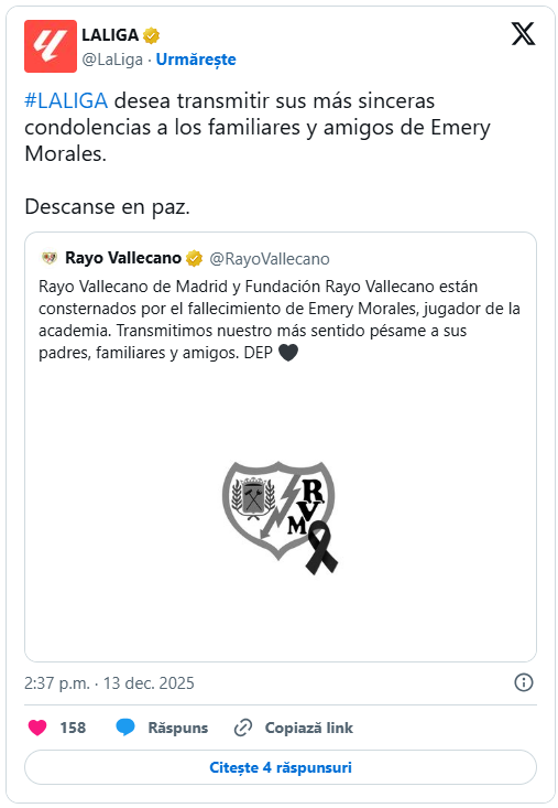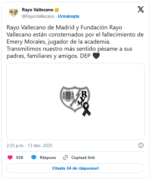 ”Toți cei de la Rayo Vallecano sunt profund afectați de moartea lui Emery Morales, jucător al academiei. Transmitem cele mai sincere condoleanțe părinților, familiei și prietenilor săi. Clubul de Fotbal Rayo Vallecano”, este mesajul clubului, apărut în online.