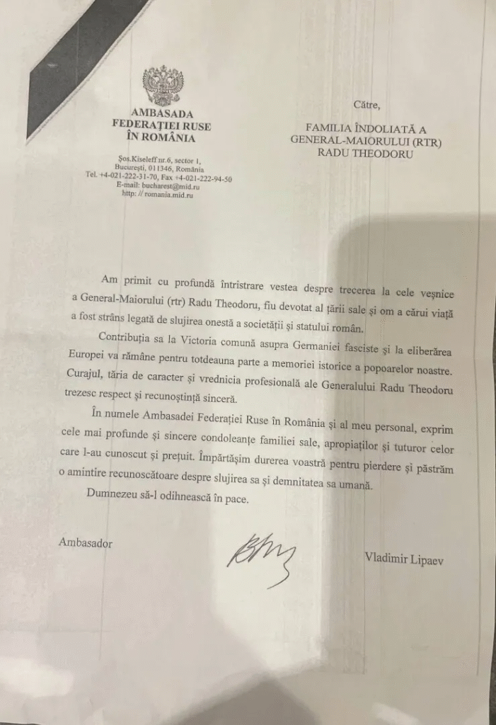 Familia generalului în retragere Radu Theodoru, decedat la vârsta de 101 ani și înmormântat ieri, a primit o scrisoare oficială de condoleanțe din partea Ambasadei Federației Ruse în România. Documentul este semnat de ambasadorul Rusiei la București, Vladimir Lipaev, și poartă antetul oficial al misiunii diplomatice ruse.