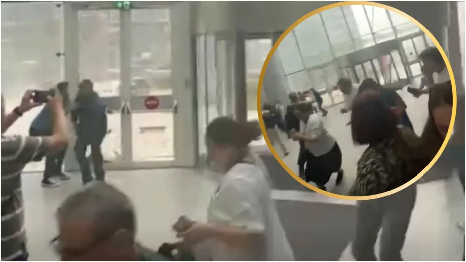 În imagini se observă cum rafalele puternice de vânt reușesc să destabilizeze ușa rotativă. Din fericire, oamenii aflați în zona respectivă nu au fost răniți, însă au trecut prin clipe de-a dreptul șocante.