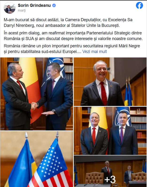 Preşedintele PSD, Sorin Grindeanu, a anunţat, marţi, că s-a întâlnit, la Camera Deputaților, cu Darryl Nirenberg, noul ambasador al Statelor Unite la București. „Am discutat despre consolidarea cooperării în domenii-cheie precum securitatea și apărarea, energia și resursele critice, dar și despre proiecte cu miză strategică atăt pentru România cât și pentru întreaga Uniune Europeană”, a transmis Grindeanu.