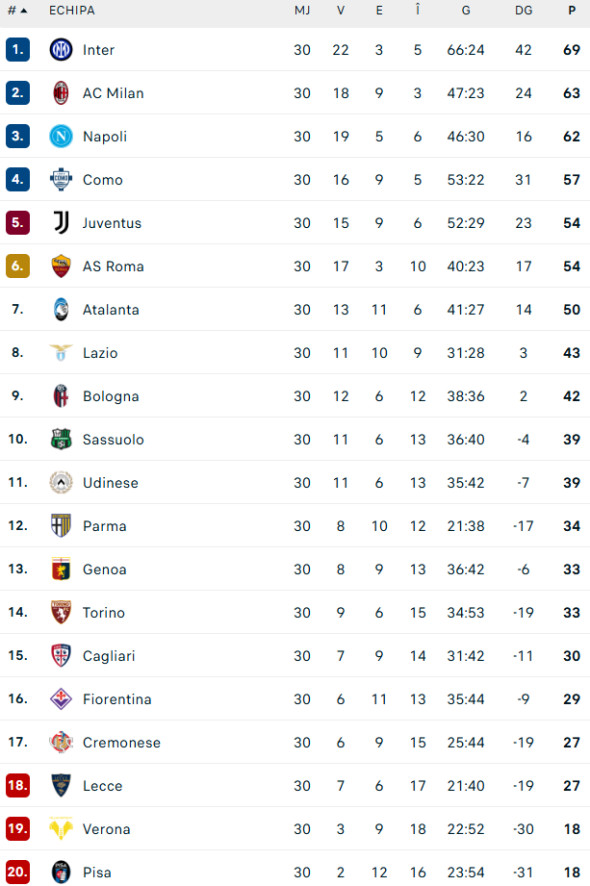 Rivala AC Milan este la 6 puncte distanță pe locul secund, iar Napoli ocupă a 3-a poziție, cu 62 de puncte.