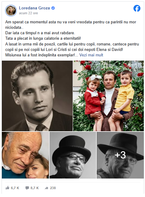 Am sperat ca momentul acesta să nu vină niciodată, pentru că părinții nu mor niciodată… Dar iată că timpul nu a mai avut răbdare. Tata a plecat în lunga călătorie a eternității!”, a scris artista pe Facebook.