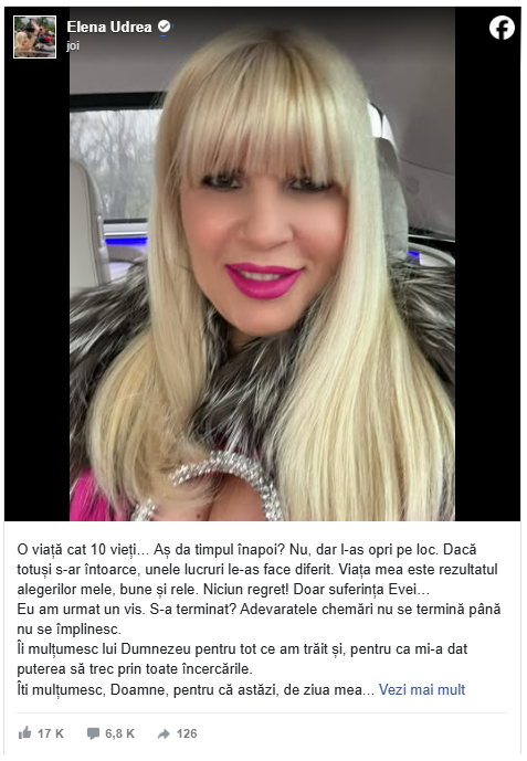 În mesajul său, fostrul ministru a făcut referire la experiențele care i-au marcat existența, menționând că fiecare etapă, fie ea bună sau rea, a contribuit la ceea ce este astăzi. Elena Udrea a vorbit despre împlinirea de a fi din nou alături de fiica ei, un aspect pe care l-a descris ca fiind cel mai important pentru ea în această zi.