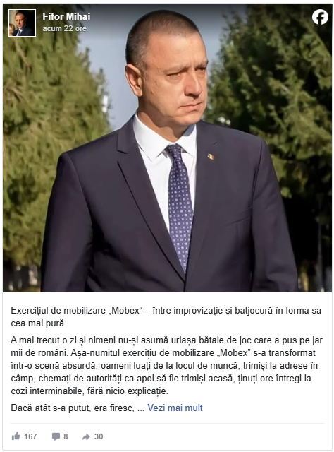 ”Exerciţiul de mobilizare „Mobex” – între improvizaţie şi batjocură în forma sa cea mai pură A mai trecut o zi şi nimeni nu-şi asumă uriaşa bătaie de joc care a pus pe jar mii de români. Aşa-numitul exerciţiu de mobilizare „Mobex” s-a transformat într-o scenă absurdă: oameni luaţi de la locul de muncă, trimişi la adrese în câmp, chemaţi de autorităţi ca apoi să fie trimişi acasă, ţinuţi ore întregi la cozi interminabile, fără nicio explicaţie”, a scris Mihai Fifor într-o postare pe Facebook.