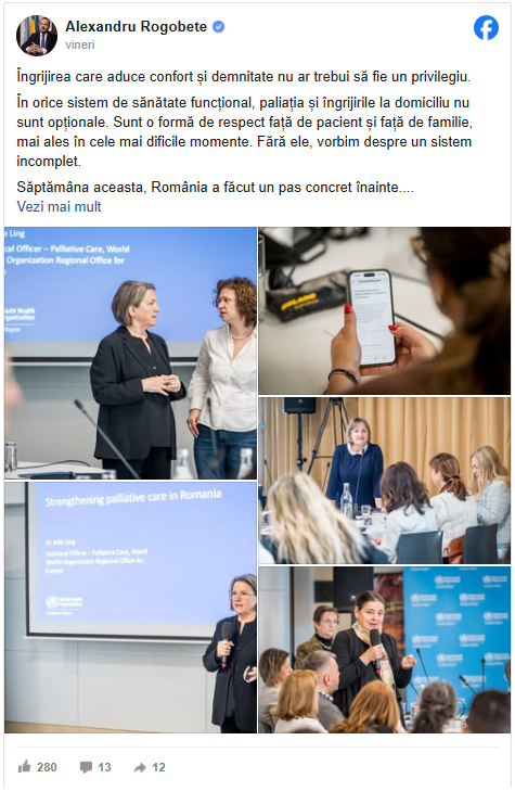 Oficialul a subliniat că în această săptămână, România a făcut un pas concret înainte: ”Peste 40 de experţi, alături de parteneri naţionali şi internaţionali, s-au întâlnit la Bucureşti, în cadrul Grupului Tehnic de Lucru pentru elaborarea Strategiei Naţionale de Îngrijiri Paliative şi Îngrijiri la Domiciliu”.