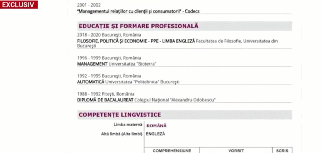 Conform jurnaliștilor de la Libertatea, în CV-ul postat pe site-ul TAROM, nu apare nimic despre Universitatea Bioterra. În schimb, scrie că a urmat cursurile altei universități private – Universitatea Athenaeum, între 1996 și 2000, unde a studiat Management.