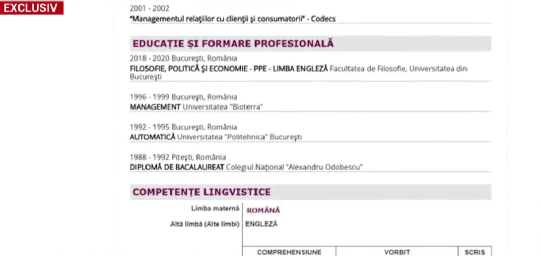 Conform jurnaliștilor de la Libertatea, în CV-ul postat pe site-ul TAROM, nu apare nimic despre Universitatea Bioterra. În schimb, scrie că a urmat cursurile altei universități private – Universitatea Athenaeum, între 1996 și 2000, unde a studiat Management.