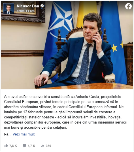 ”Am avut astăzi o convorbire consistentă cu Antonio Costa, preşedintele Consiliului European, privind temele principale pe care urmează să le abordăm săptămâna viitoare, în cadrul Consiliului European informal. Ne intalnim pe 12 februarie pentru a găsi împreună soluţii de creştere a competitivităţii statelor noastre – adică să încurajăm investiţiile, inovaţia, dezvoltarea companiilor europene, care în cele din urmă înseamnă servicii mai bune şi accesibile pentru cetăţeni”, a scris Nicuşor Dan pe pagina sa de Facebook.