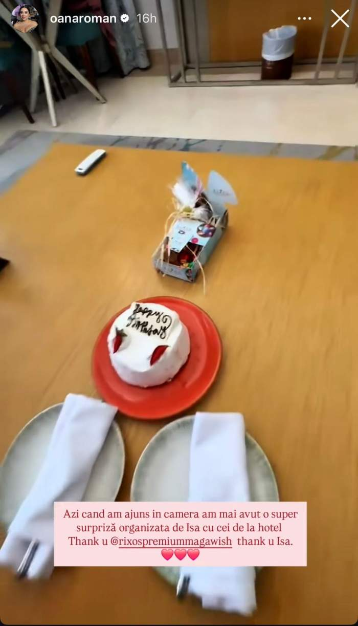 „Suntem în Egipt, într-un resort foarte, foarte frumos, și aici am avut parte de o groază de surprize. Iza s-a organizat cu stafful pentru a îmi face surprize. Dimineața am avut floating breakfast în piscină noastră, după aceea am fost la plajă, am avut o cabană specială rezervată. Mi-a făcut surpriză și în cameră, după am mers la restaurant, unde mi-au cântat La mulți ani.”, a declarat Oana Roman pentru Spynews.ro.