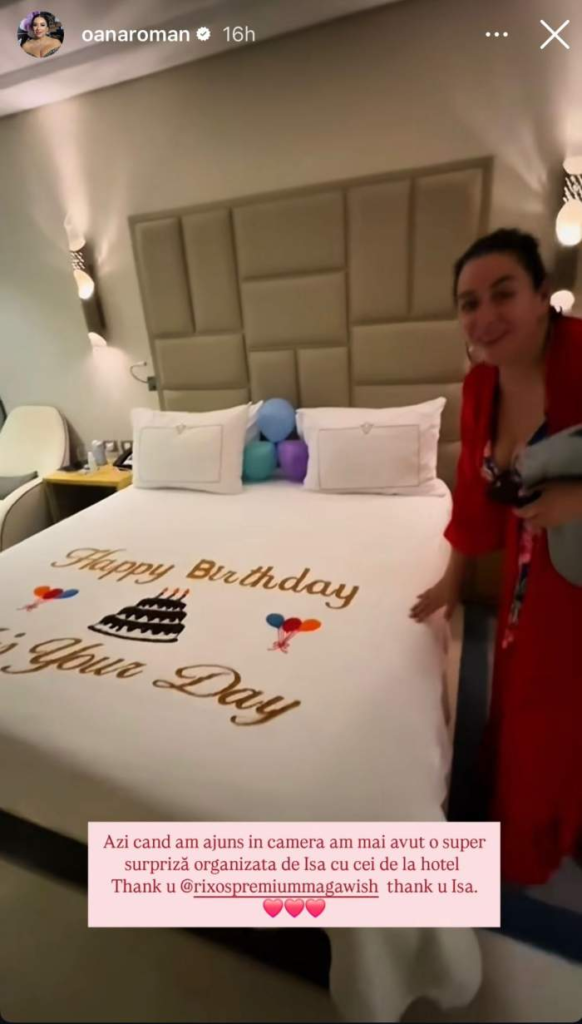 Oana Roman a povestit că își sărbătorește ziua de naștere în Egipt, într-un resort deosebit, unde a avut parte de numeroase surprize. Vedeta a spus că fiica sa, Izabela, s-a organizat cu stafful hotelului și i-a pregătit momente speciale pe tot parcursul zilei, de la micul dejun în piscină și plajă, până la surprize în cameră și o aniversare la restaurant, unde i s-a cântat „La mulți ani”.