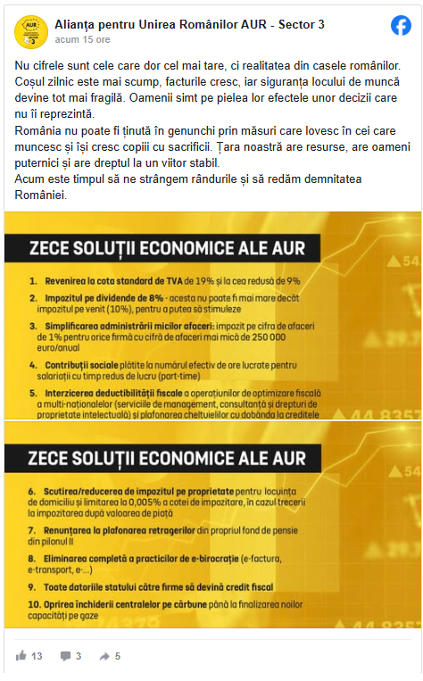 Formațiunea politică subliniază că România deține resursele necesare pentru a asigura un viitor prosper, însă consideră că managementul actual ține țara „în genunchi”. În viziunea AUR, dreptul la un viitor stabil este încălcat de măsuri care pedepsesc efortul și munca cinstită, în loc să le protejeze.