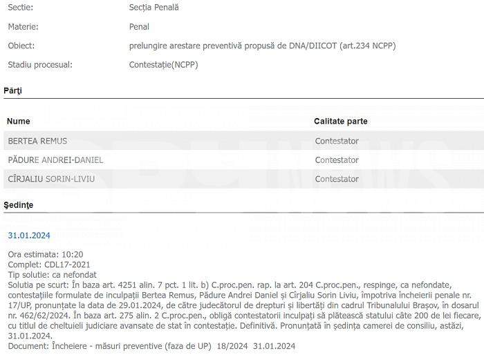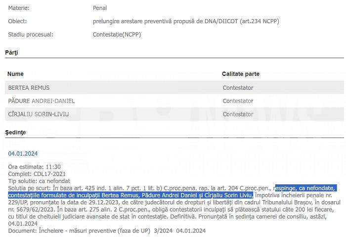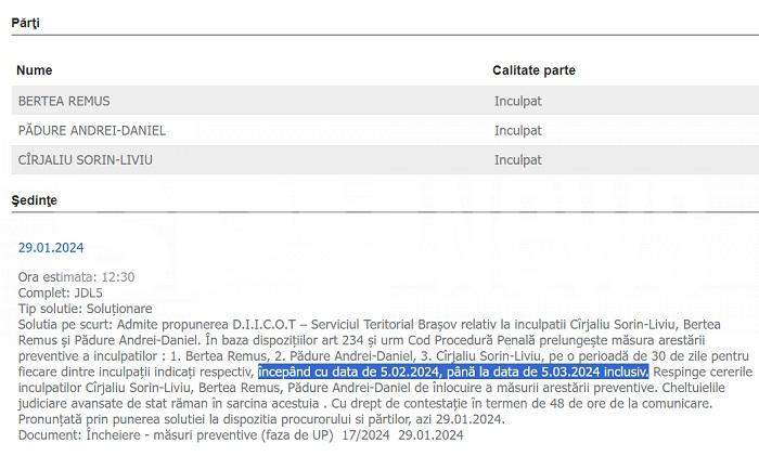 Ulterior, numele femeii a dispărut din dosarul care viza măsurile preventive, iar în urmă cu o lună instanța a decis: „Admite propunerea D.I.I.C.O.T – Serviciul Teritorial Braşov relativ la inculpatii Cîrjaliu Sorin-Liviu, Bertea Remus şi Pădure Andrei-Daniel. Prelungeşte măsura arestării preventive a inculpatilor: 1. Bertea Remus, 2. Pădure Andrei-Daniel, 3. Cîrjaliu Sorin-Liviu, pe o perioadă de 30 de zile pentru fiecare dintre inculpaţii indicaţi respectiv, începând cu data de 5.02.2024, până la data de 5.03.2024 inclusiv. Respinge cererile inculpatilor Cîrjaliu Sorin-Liviu, Bertea Remus, Pădure Andrei-Daniel de înlocuire a măsurii arestării preventive”.