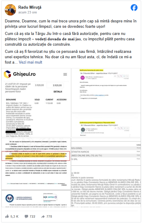 Miruță a publicat pe Facebook dovada plății – 3.920 de lei pentru o casă aflată în Municipiul Târgu-Jiu.