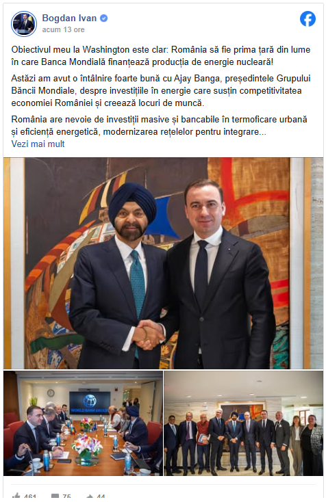 Aflat într-o vizită oficială la Washington, ministrul energiei, Bogdan Ivan, a pus bazele unui acord istoric pentru securitatea energetică a țării în cadrul întâlnirii cu Ajay Banga, președintele Grupului Băncii Mondiale. Obiectivul central al discuțiilor este transformarea României în prima țară din lume care beneficiază de finanțarea Băncii Mondiale pentru producția de energie nucleară. Ministrul a subliniat că energia nucleară reprezintă pilonul de stabilitate al mixului energetic românesc, fiind esențială pentru susținerea competitivității economiei și crearea de noi locuri de muncă.
