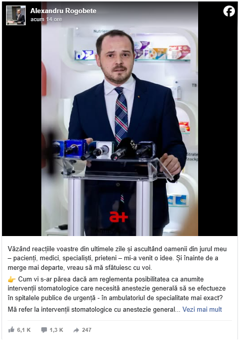 Rogobete descrie şi cadrul pe care îl are în vedere: „Mă refer la intervenții stomatologice cu anestezie generală, realizate în condiții de siguranță, în cadrul unor cabinete de stomatologie înființate în ambulatoriile spitalelor publice.”