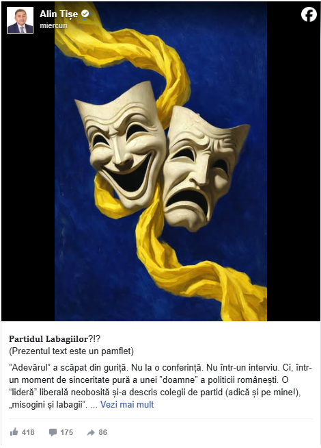 În mesajul publicat pe Facebook, Alin Tișe, președinte CJ Cluj, atrage atenția că situația a depășit demult zona unei simple dispute interne și că limbajul folosit în spațiul public compromite imaginea partidului.