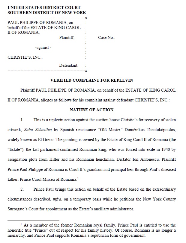 „În februarie 2025, Philippe și România au intervenit în mod necorespunzător pentru a împiedica Accent să vândă Sfântul Sebastian, o pictură a artistului „Maestru Vechi” din Renașterea spaniolă, Doménikos Theotokópoulos, cunoscut sub numele de El Greco („Pictura”). Accent achiziționase lucrarea în 2010 de la un comerciant de artă profesionist, cel mai recent dintre mai mulți proprietari care își au originea până la regele Mihai I al României. Accent a aflat ulterior că România i-a permis regelui Mihai I să ia pictura și altele cu el atunci când guvernul comunist l-a forțat să abdice de la tron în 1947”, se arată în dicuemntul depus.