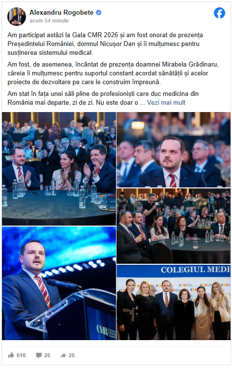 „Am participat astăzi la Gala CMR 2026 și am fost onorat de prezența Președintelui României, domnul Nicușor Dan și îi mulțumesc pentru susținerea sistemului medical.