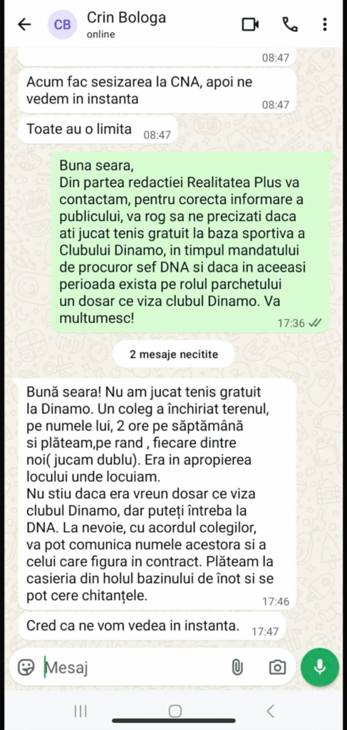 Crin Bologa nu a negat că ar fi jucat la Dinamo, însă a declarat că plătea pentru asta și că nu știa de existența vreunui dosar. Contactat de jurnaliștii Realitatea PLUS pentru un punct de vedere, fostul șef DNA a declarat:
