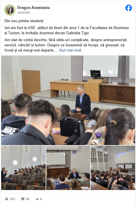 După ce în urmă cu mai puțin de un an Dragoș Anastasiu demisiona din funcția de vicepremier și recunoștea că a dat șpagă, astăzi afaceristul controversat se laudă pe Facebook că le-a dat lecții studenților de la business și turism.
