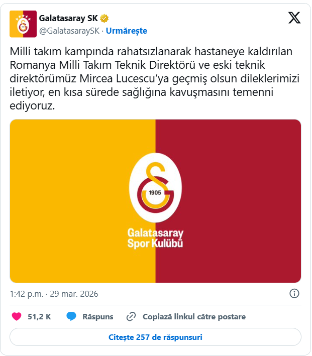 „Îi transmitem cele mai bune gânduri lui Mircea Lucescu, selecționerul echipei naționale a României și fostul nostru antrenor, care a fost internat în spital după ce i s-a făcut rău în cantonamentul echipei naționale. Sperăm că își va reveni cât mai curând posibil”, a transmis Galatasaray, într-o postare pe rețelele sociale.
