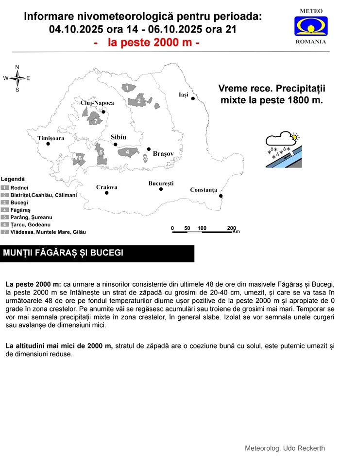 Totodată autoritățile au emis o informare nivometeorologică, valabilă în perioada 4-6 octombrie, cu privire la stratul de zăpadă care, la acest moment, depășește 20 de centimetri la altitudini mari.