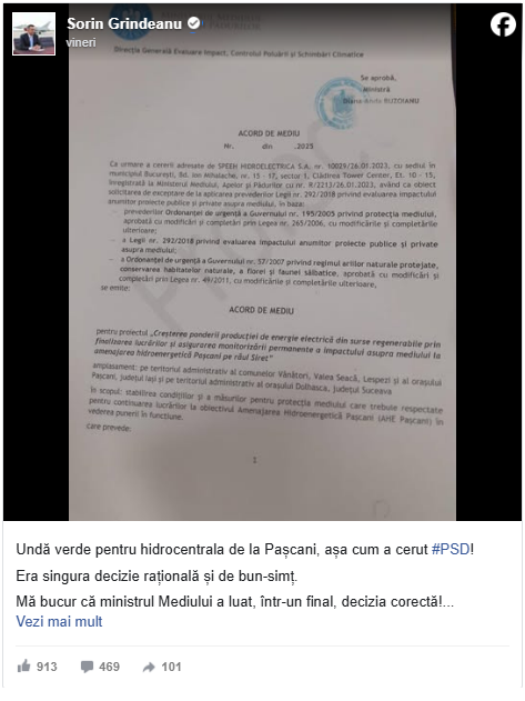 Declarația președintelui interimar al PSD a avenit la scurt timp după ce ministrul Mediului, Diana Buzoianu, a anunţat că lucrările de la hidrocentrala Paşcani au primit, vineri, acordul de mediu, după analiza reprezentanaţilor Administraţiei Apele Române şi după trei modificări aduse studiului de impact.